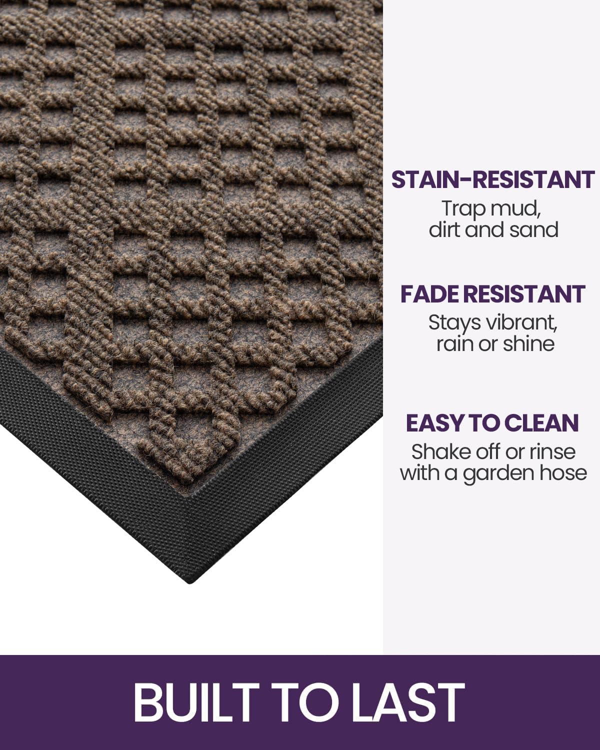 - Easy to Clean: Simply use a vacuum cleaner, or sweep with a broom, or pat the rubber backing and shake the outdoor mat. For a deeper clean, use a garden hose to rinse the doormat, and fully air dry