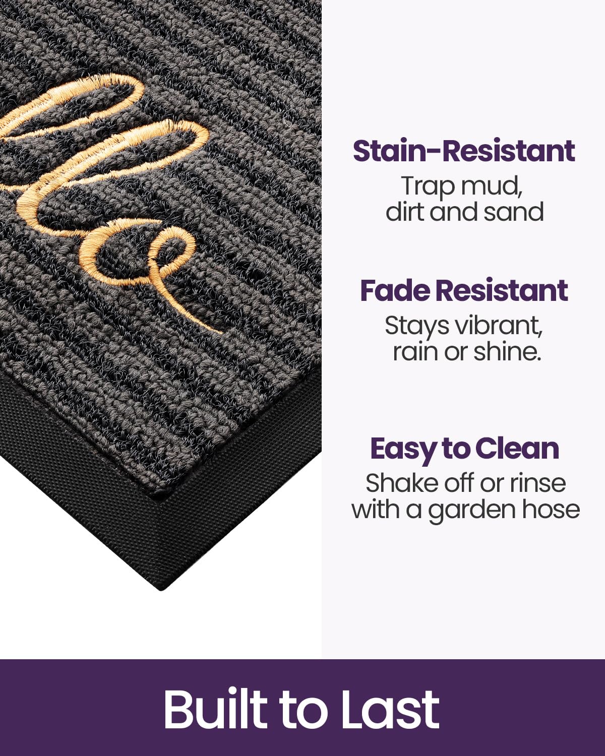 - Easy to Clean: The washable door mat finished with well-made texture, which makes it possible to be fade resistant and stain resistant after washing. Simply slap the door mat outdoors or clean it via vacuum cleaner. For deeper cleaning, you can rinse with a hose